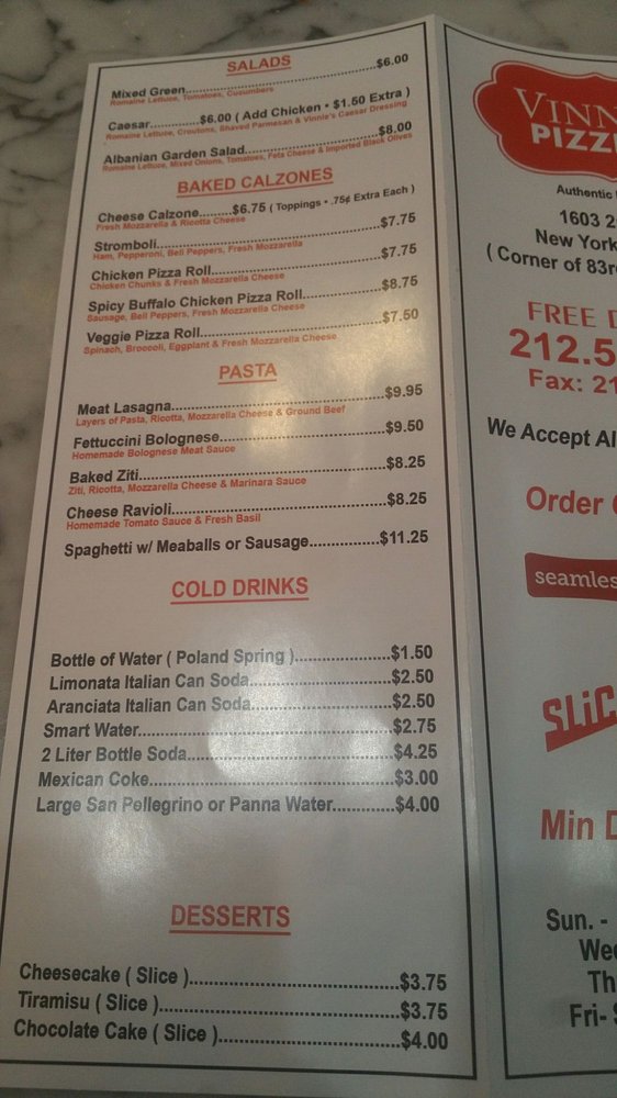 Welcome to Vinnie's Pizza, a charming Italian gem tucked away in the heart of New York City! Renowned for its inviting ambiance and iconic brick walls, this pizzeria captures the essence of New York's dining scene. The menu offers an enticing array of options that cater to every palate.